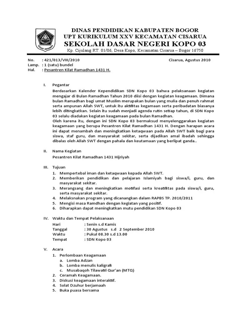 Contoh proposal kegiatan pesantren kilat ramadhan 1437 h/ 2016 m. Permohonan bantuan dana pembangunan fasilitas ruang belajar. Dan asrama santri pondok pesantren . Waktu dan tempat kegiatan pembangunan. Proposal kegiatan pesantren kilat smp negeri 14 depok 1434 h / 2013 m i.